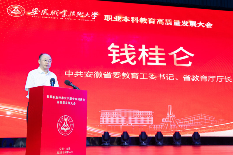 钱桂仑代表省委教育工委、省教育厅,向安徽职业技术大学的设立表示最热烈的祝贺。他指出,安徽职业技术大学是安徽职业教育改革发展的一张靓丽名片,作为我省首批职业本科院校,在全省优化职业教育类型定位、持续推进现代职业教育体系建设改革进程中,发挥着重要的示范和引领作用。希望学校聚焦立德树人,筑牢职业教育初心;聚焦内涵建设,提升人才培养质量,紧紧围绕我省重点产业布局,动态调整专业结构,加强校企合作,深化产教融合,推动教育链、人才链与产业链、创新链有机衔接;聚焦需求导向,增强社会服务能力,推动学校办学与国家及我省战略布局、重点产业需求、地方经济社会发展、促进人的全面发展相结合,进一步增强职业教育适应性,助力区域经济社会高质量发展。钱桂仑表示,省委教育工委、省教育厅将一如既往地关心、支持安徽职业技术大学发展!