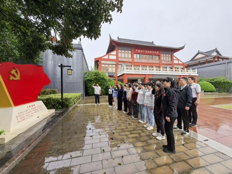 参观结束后,全体党员在主馆前整齐列队,面向鲜红的中国共产党党旗肃立。在学院党总支纪检委员范从先的带领下,大家高举右拳、眼神坚定,逐字逐句重温入党誓词。铿锵有力的誓言回荡在馆区上空,不仅是对革命先烈的深切缅怀,更是对初心使命的庄严承诺,让每一位党员在庄重仪式中再次接受党性教育,强化师德担当。