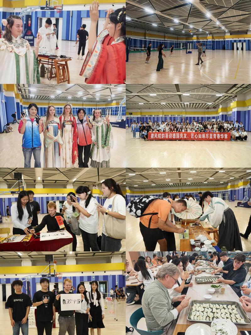 下午,德国师生参观了徽文化实践教学基地、智能制造学院、心理解压室、直播实训室、信息安全实训室、体育馆,参加了社团活动。德国师生在书画协会、绿色环保协会和酒店协会体验了毛笔字书写,并观赏了手工作品和环保作品,在知礼国学社和思源文学社体验了中国传统服装和书画文化,并与乒乓球协会、校篮球协会及羽毛球协会的同学进行了热烈的互动。德方师生认为我校的现代化教学环境与浓厚的人文气息完美结合,给他们带来了非凡的体验。