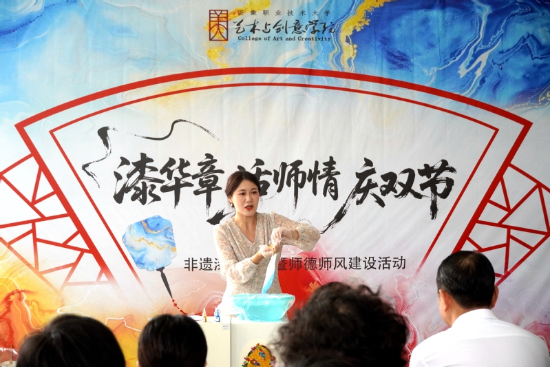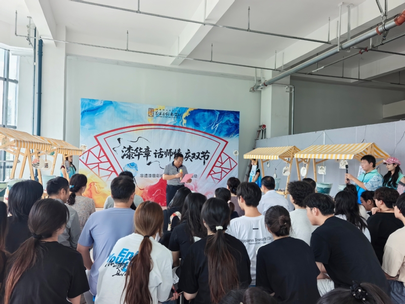 为深入推进师德师风建设,弘扬中华优秀传统文化,9月28日下午,艺术与创意学院在至明楼一楼东展厅举办了“漆华章 话师情 庆双节”非遗漆扇彩绘暨师德师风建设活动。校领导李荣富,学院党政主要负责人及师生代表齐聚一堂,共同度过一段融合了艺术之美与师德之思的温馨时光。活动由党总支书记李仿民主持。