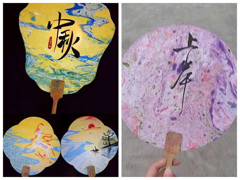 视传与形象设计教研室徐冰清老师作了生动的扇面漂漆技法示范。她细致讲解了漆料的特性、入水的技巧以及如何通过不同的手法让漆料在扇面上形成独一无二的流纹与色彩层次。随后,活动进入核心环节,大家纷纷动手实践,投入到扇面漂漆与彩绘的创作中。活动现场气氛热烈。五彩的漆料在水面晕开,再经由巧手轻蘸,一幅幅流光溢彩、浑然天成的图案便定格于素白的扇面之上。每一把漆扇都成为了一件独特的艺术品,凝聚了师生们的巧思与对美的理解。