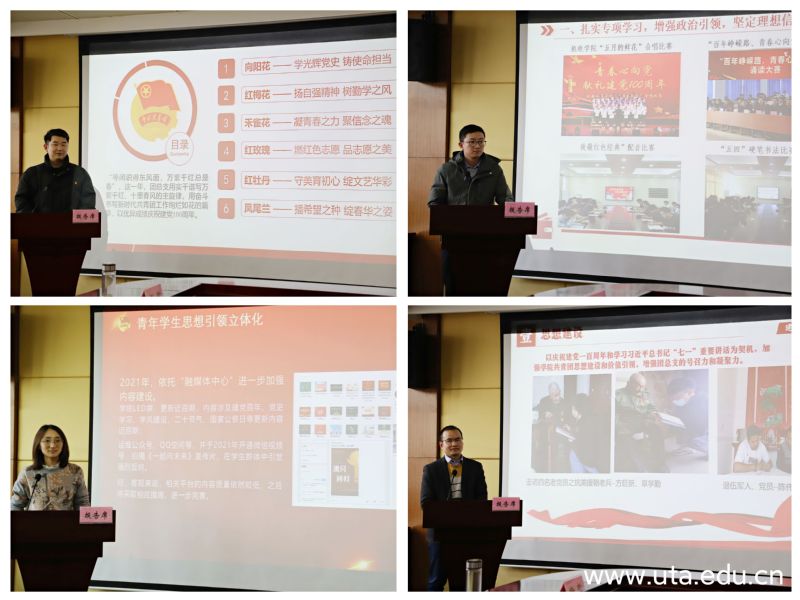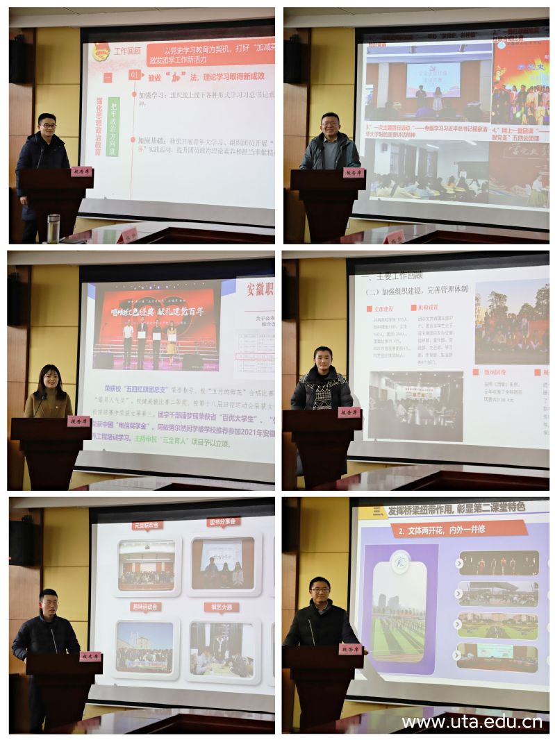 本网讯 (院团委通讯员 石可 刘心洁)为不断深化共青团改革,充分发挥团总支作用,增进团学工作经验交流,2月23日下午,学院在行政楼十楼会议室召开2021年度团总支考核现场述职交流会。党委委员、副院长宣岩松到会指导,体育健康学院党总支书记张在腾、马克思主义学院党总支负责人钱洁、学生处负责人李瑞勇、保卫处负责人李仿民出席会议并担任评委。院团委全体人员,各二级学院团总支书记、团总支副书记参加会议,会议由院团委负责人余搏立主持。