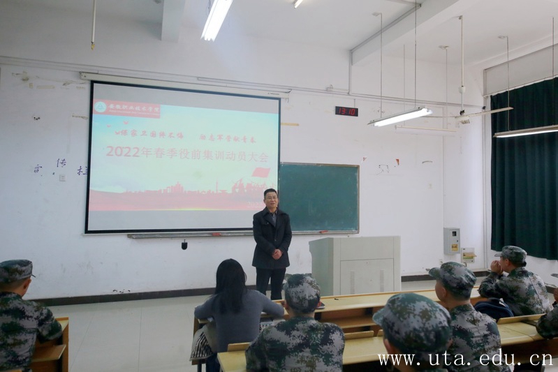 本网讯(学生处通讯员 郑莉 朱艳丽) 3月7日中午,2022年春季役前集训动员大会在电教楼104召开。学党委委员、副院长宣岩松出席动员大会,学生处工作人员和66名准新兵参加会议。会议由学生处心理健康教育中心主任杨珍主持。