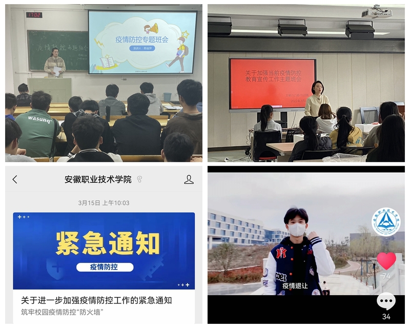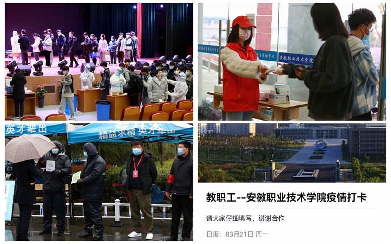 学院健全防控责任体系,建立领导有力、组织严密、反应迅速的防控工作机制,加强联防联控。严格落实24小时应急值班值守制度,做到守土尽责,筑牢校园疫情防控“防火墙”;制定车辆、行人分流措施和大门区域的交通管控措施,规范校园门岗测温、查验、登记、引导程序;加强对师生员工的管控力度,要求全体师生员工近期非必要不出省,非必要不离肥,有力有序开展好多轮全员核酸检测工作,组织做好师生接种新冠疫苗工作,确保应查尽查、应检尽检、应接尽接;全体师生员工持续加强个人防护,戴口罩、勤洗手、常通风、少外出、不聚集,保持安全社交距离;严格执行师生员工每天“钉钉”APP健康打卡和报送工作,坚持“晨、午、晚检”制度,实行“日报告、零报告”,全面摸排并掌握全校师生员工行程和健康状况,同时加强与属地政府及卫生、疾控部门的沟通协调,共同做好防控工作。