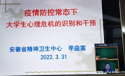 仪式结束后,季益富作了题为“疫情防控常态化下大学生心理危机识别与干预”的线上直播讲座。他从心理危机概述、常见精神心理疾病症状及其干预措施等方面进行了阐述,并结合生动案例和临床经验,重点讲述了抑郁症的诊断与应对方法。在互动环节中,季益富从专业角度对老师们提出的工作困惑进行了一一解答。本场讲座理论详实、案例生动,操作性和互动性强,进一步提高了我校学生工作人员对疫情防控下学生心理危机事件的科学认识,提升了心理危机干预的技能,对有效识别、预防和处理大学生心理危机事件,维护校园安全稳定具有重要作用。