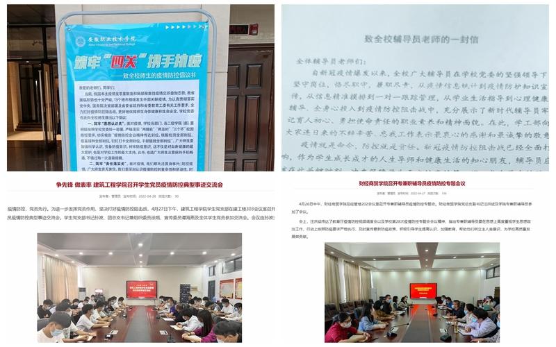 坚持内紧外松,加强舆论引导。学院坚持主动发声、正面引导,发布《筑牢“四关” 携手抗疫——致全校师生的疫情防控倡议书》《致全校辅导员老师的一封信》,依托学院“安职大讲堂”等平台,讲好学院抗疫故事;开展QQ群、微信群等学院新媒体排查工作,积极营造良好舆论氛围;加大学院各级各类通讯员培训力度,严防“低级红”“高级黑”现象;做细做好关心关爱学生工作,引导学生通过合理途径反映诉求;及时召开疫情防控专题会,把上级和学院疫情防控精神宣贯到每一位师生,讲深讲透疫情防控知识、讲细讲活防疫措施,使师生入脑入心,见之于行。