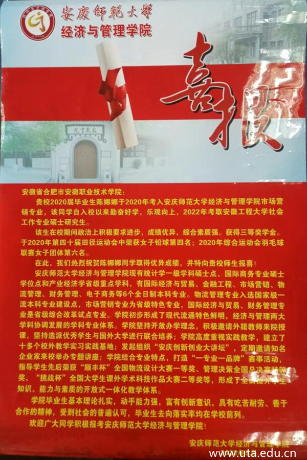 本网讯(财经商贸学院通讯员 范海宁)近日,安庆师范大学经济与管理学院向我院发来喜报:热烈祝贺学院2020届市场营销专业毕业生陈娜娜取得优异成绩,并向学院师生报喜,祝贺陈娜娜考入安徽工程大学社会工作专业硕士研究生。
