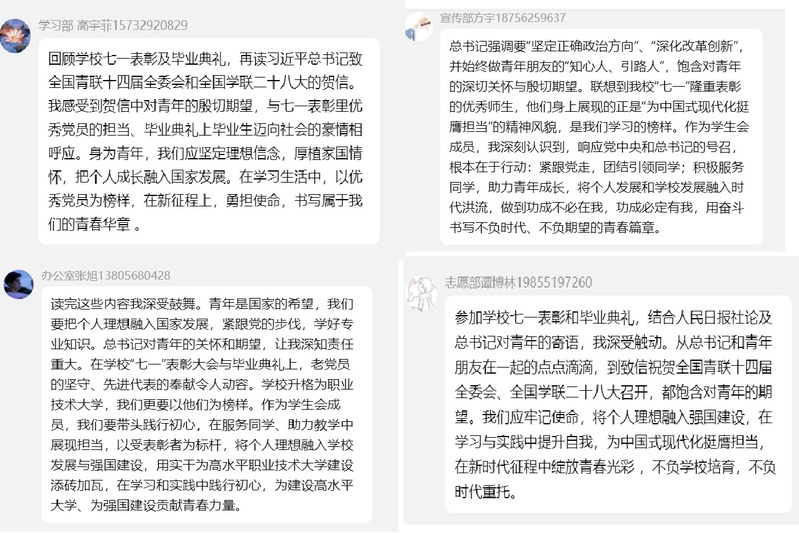 学习会上,团员青年们认真研读习近平总书记的贺信内容。贺信强调,青年要坚定理想信念,培育高尚品格,练就过硬本领,勇于创新创造,矢志艰苦奋斗。同学们深受鼓舞,纷纷表示要牢记总书记嘱托,以更加昂扬的斗志投身学习和实践,为学校职教本科升格更有“格”添砖加瓦。