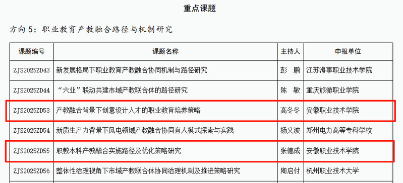 近日,中华职业教育社2025年度规划课题拟立项名单公示,安徽职业技术大学获批4项,是全国立项最多的高校。中华职业教育社2025年度规划课题共申报3065项,拟立项课题226项,我校是全国唯一一所立项4项的高校,其中2项是重点项目。这是在2023年学校荣获黄炎培职业教育“优秀学校奖”基础上的又一重要突破,标志着学校在升格为本科层次职业技术大学后科研实力进一步提升,是学校坚定不移发展有组织科研的重要体现。