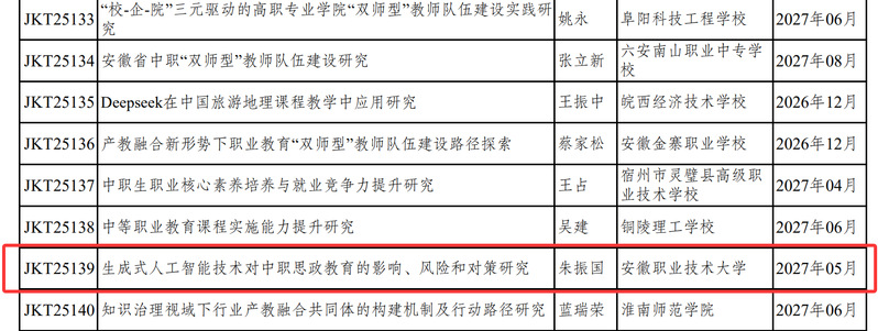 近日,安徽省教育厅正式发布《安徽省教育厅关于公布2025 年度安徽省教育科学研究项目立项评审结果的通知》(皖教秘〔2025〕176号)。经省教育厅组织评审,我校朱振国副教授申报的课题——《生成式人工智能技术对中职思政教育的影响、风险和对策研究》成功获批为重点项目。