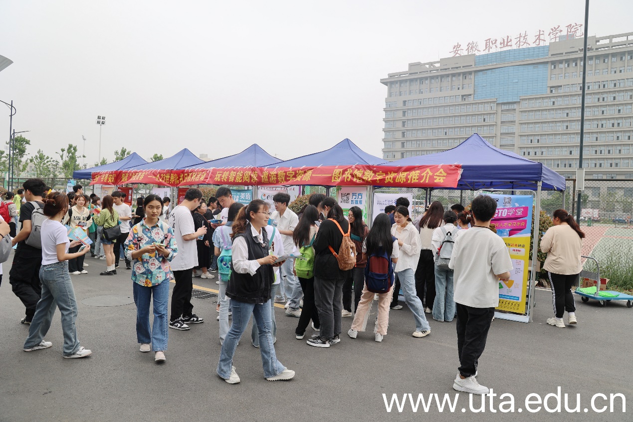 本次推介会邀请了万方数据服务平台、中国共产党思想理论资源数据库、读秀知识库、超星学术视频、51CTO学堂数据库、工程科技图书馆数据库、环球英语多媒体资源库、云图数字有声图书馆、设计师之家、E博在线微信图书馆、全球大学生创新创业与就业升学视频资源平台等数10余家数据库供应商。推介活动于上午11时正式开始,前来咨询的师生读者络绎不绝,图书馆工作人员、资源合作方和志愿者们热情地向现场读者介绍了“世界读书日”的由来,宣传图书馆四月份正在开展的系列读书活动、图书馆藏书查阅方法和电子资源的使用方法等,倡导全体青年大学生从自身做起,让读书成为习惯,让书香充满校园,让阅读丰盈人生。