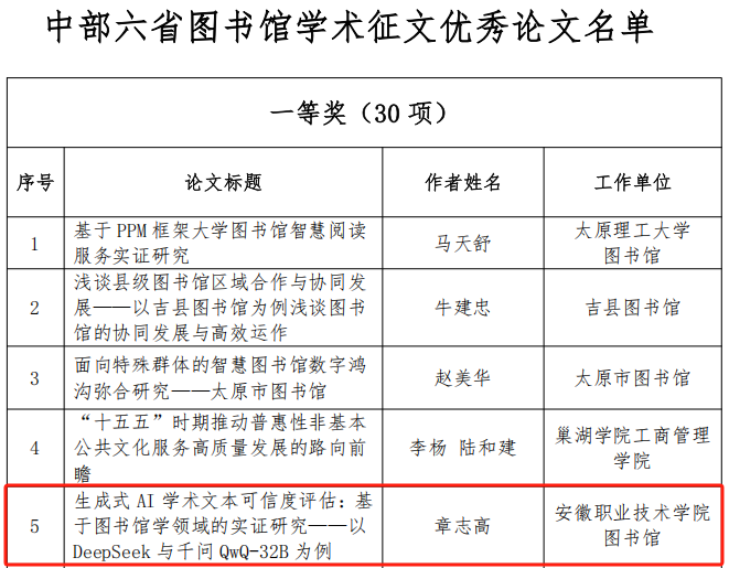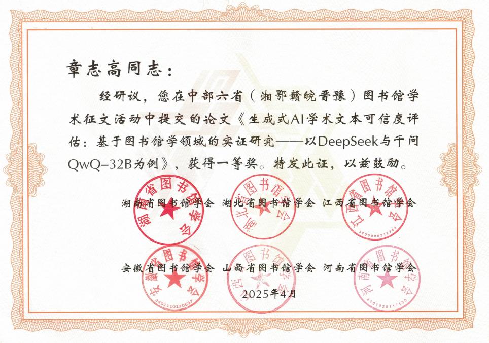 近日,由中部六省公共图书馆联盟及六省图书馆学会联合主办的学术征文活动圆满结束,我院图书馆教师章志高凭借《生成式AI学术文本可信度评估:基于图书馆学领域的实证研究——以DeepSeek与千问QwQ-32B为例》从576篇参评论文中脱颖而出,荣获一等奖。