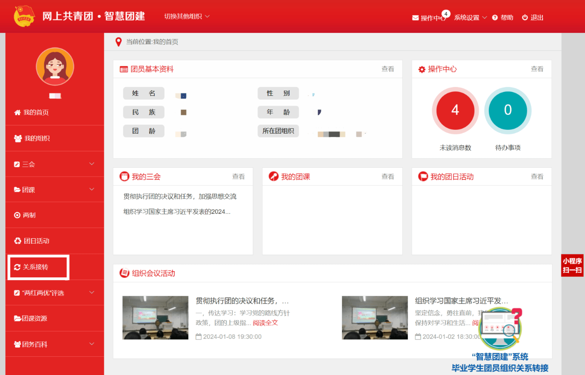 团员本人登录智慧团建,在个人中心点击:关系转接——组织关系转接——填写转接申请信息——提交即可。请新生团员明确自己所隶属的学院、专业、班级,待新生入学后。把个人团组织关系转接到相应的学院、专业、班级团组织中。