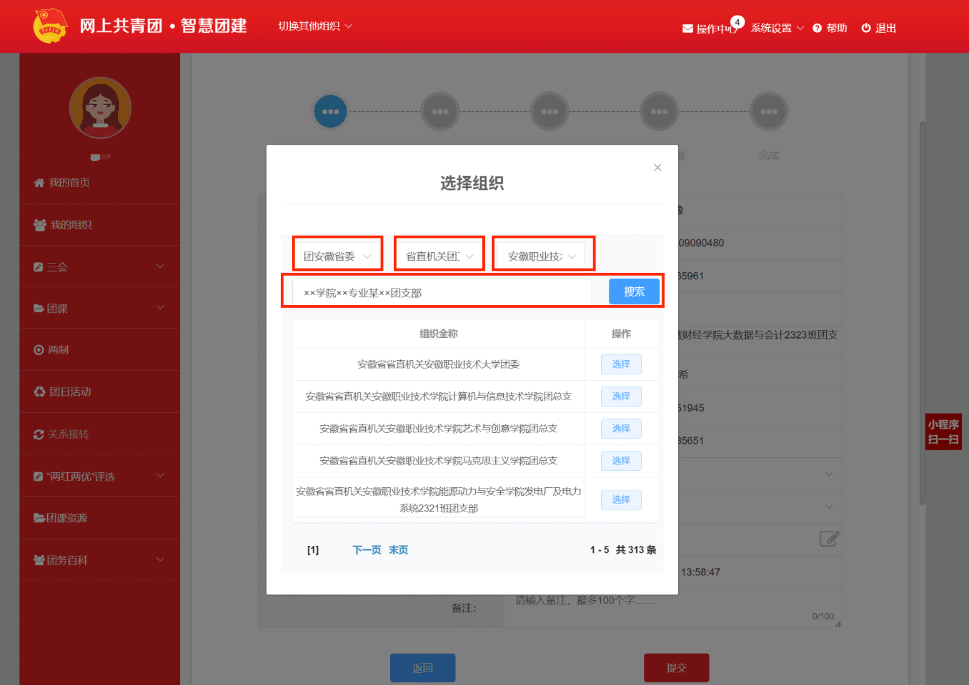 3.选择组织时依次勾选:团安徽省委——省直机关团工委(安徽省省直机关团工委)——安徽职业技术大学团委——某某学院某某专业某某班团支部。