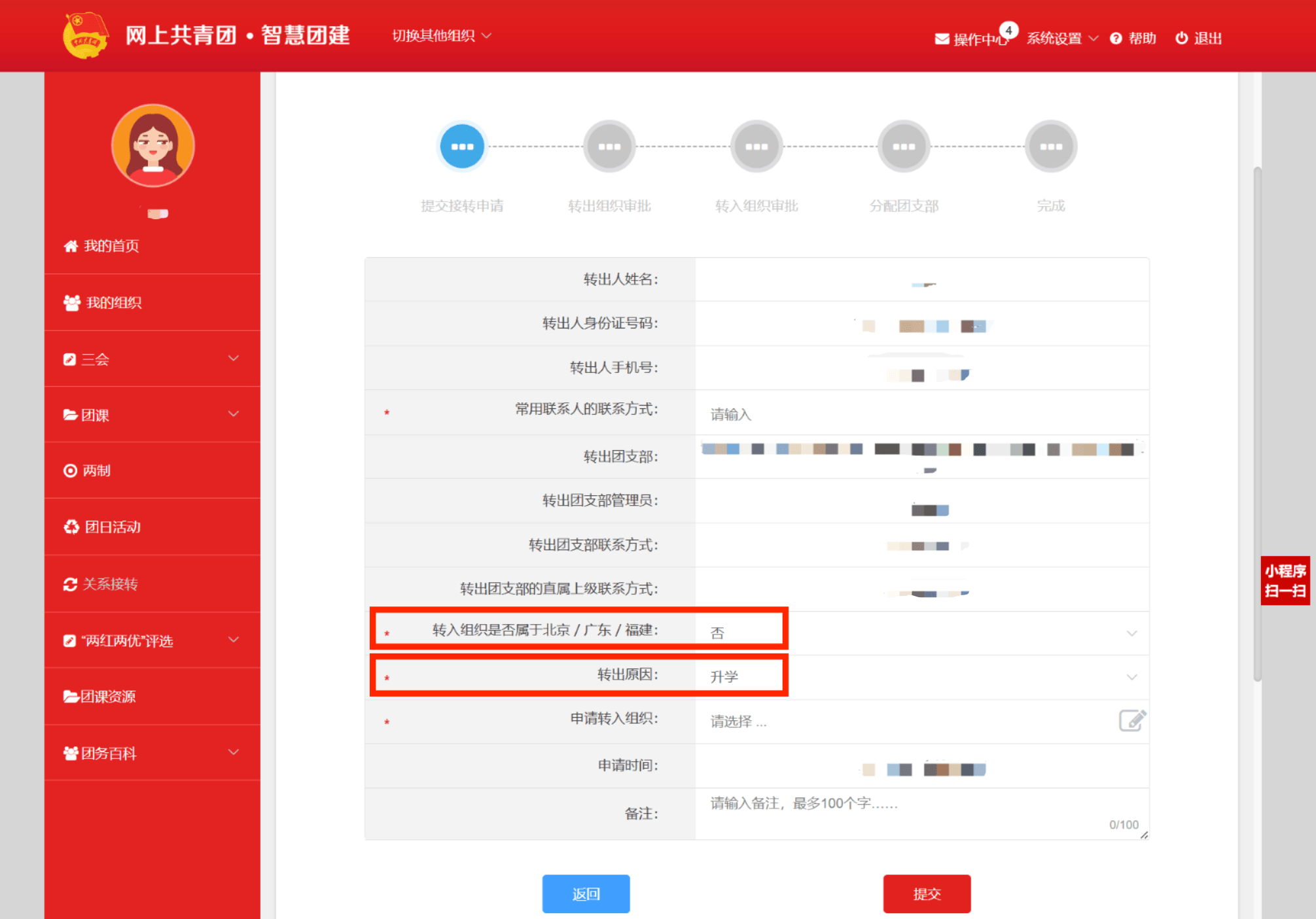 1.转入组织是否属于北京/广东/福建(选“否”)。
