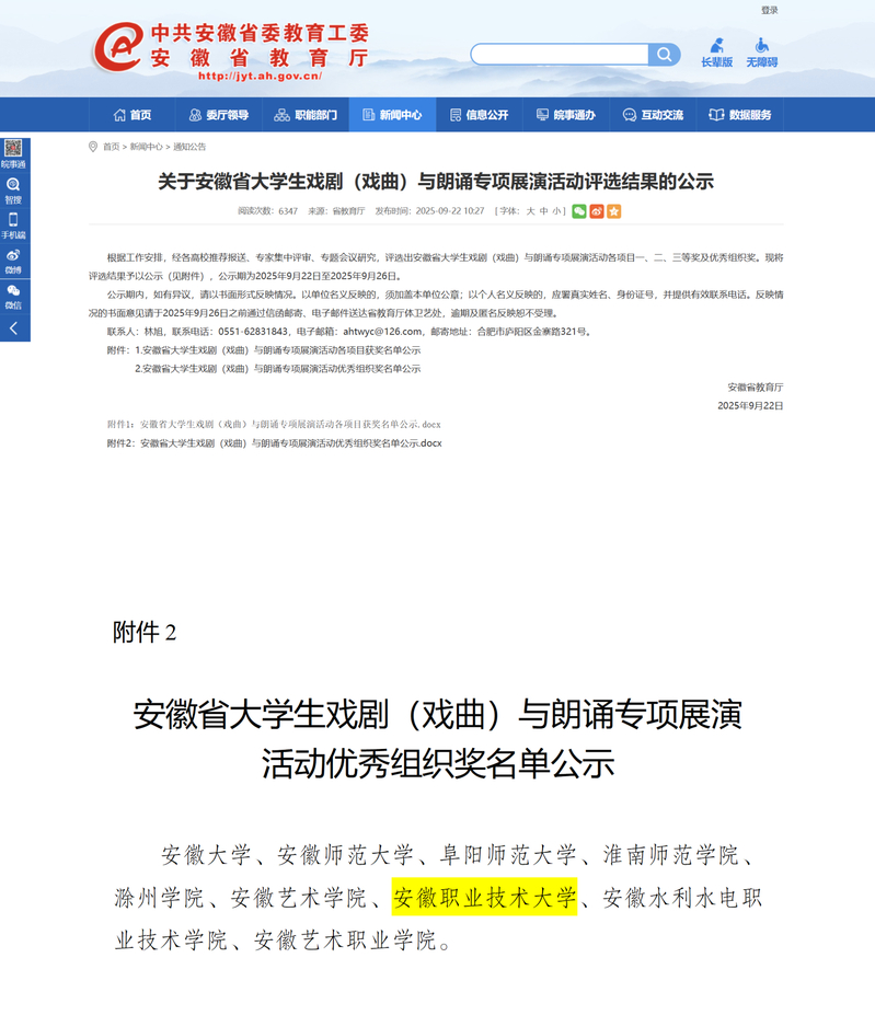 近日,安徽省大学生戏剧(戏曲)与朗诵专项展演活动评选结果公布。我校报送的11个节目全部获奖,共斩获一等奖5项、二等奖4项、三等奖2项。同时,我校获评“优秀组织奖”,成为全省获此殊荣的9所高校之一,充分展现了我校在立德树人与美育工作中的扎实成效。