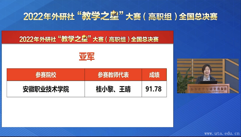 今年外研社在“教学之星”大赛创办十周年之际,首次举办高职组全国总决赛。外国语学院教师团队从5月-12月,历经初赛、省赛、全国复赛、全国半决赛层层选拔,登上全国总决赛巅峰讲台,充分展示了安职教师的教学风采。