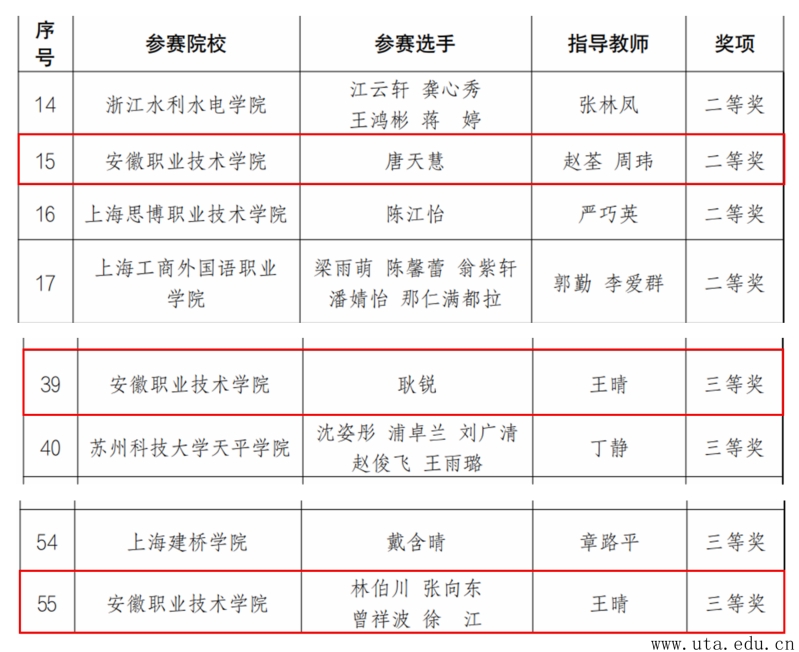 (外国语学院通讯员 冷慧勤 王晴)日前,第四届长三角应用型高校“中国故事”英语视频大赛评选工作落下帷幕,此次大赛是由长三角教育一体化发展领导小组办公室总秘书处、中共上海市民办高校工作委员会、上海高职高专思想政治理论课建设联盟共同主办的。安职院作为安徽唯一的一所参赛学校取得佳绩,其中外国语学院赵荃、周玮老师指导的市场营销2024班唐天慧同学荣获二等奖,王晴老师指导的2022级土木专升本①班耿锐同学及林柏川团队均获得三等奖。