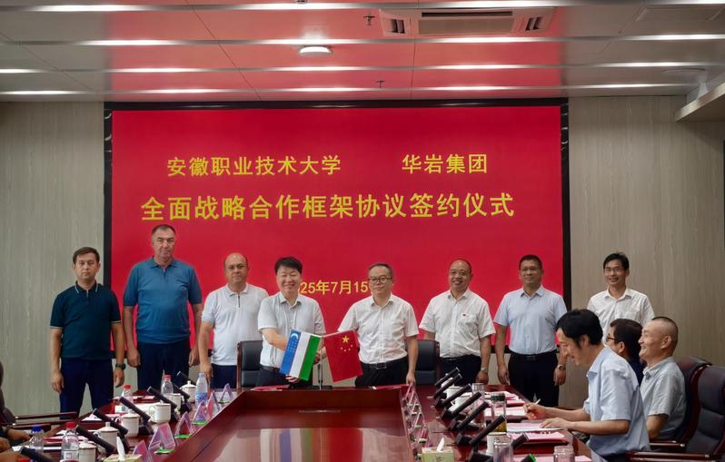 在市长代表团见证下安徽职业技术大学华岩集团“两区一园”产业园正式签署战略合作协议。协议明确三项核心任务:一是共建“中乌国际学院”,定向培养汽车工程、智能制造技术人才;二是开设“华岩中亚班”,为入驻华岩产业园的中企输送双语技能型员工;三是联合开发乌兹别克斯坦行业职业标准,推动中国职教标准“走出去”。签约仪式后,校方向乌方赠送徽派非遗工艺品“迎客松”铁画,象征文化互鉴与友谊长