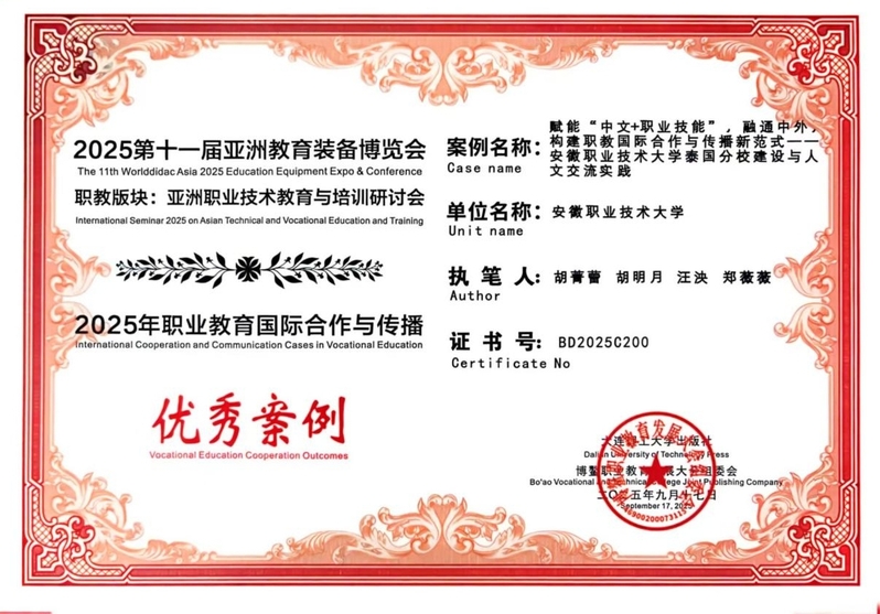 此外,学校申报的《构建职教国际合作与传播新范式一安徽职业技术大学泰国分校建设与人文交流实践》案例,成功入围“2025年职业教育国际合作与传播”优秀案例,杨林国代表学校上台领奖。