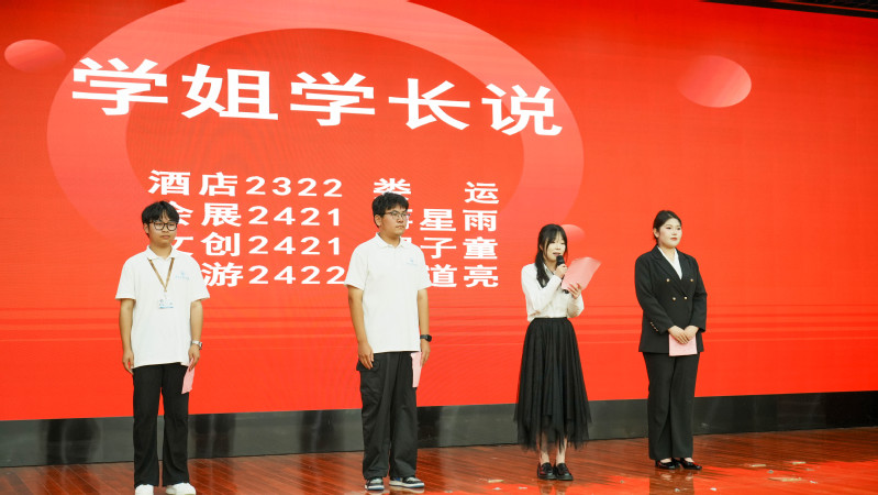 师者匠心,润物无声。教师代表酒店教研室夏必琴、旅游教研室张文静、会展教研室张婉悦、文创教研室马明晖相继发言,从专业特色、行业前景到学业规划,为新生描绘出一幅清晰而精彩的大学蓝图。学姐学长说环节中,酒店2322班娄运、会展2421班蒋星雨、文创2421班胡子童、旅游2422班付道亮四位优秀老生代表分享了他们的成长经历,用亲身实践为学弟学妹们指明了前行的方向。