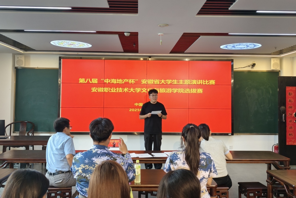 9月19日,文化与旅游学院在安徽文化实践教学基地举办第八届“中海地产杯”安徽省大学生主题演讲比赛学院选拔赛。本届比赛以“青春为中国式现代化挺膺担当”为主题,聚焦大学生成长成才,着力提升学生演讲表达与综合素养,引导青年坚定理想信念、传承红色基因、弘扬徽文化、投身实践锻炼,切实肩负起新时代的责任与使命。学院专职组织员伍智鑫、语言文字委员会专职教师许颖、团总支书记安君担任评委。
