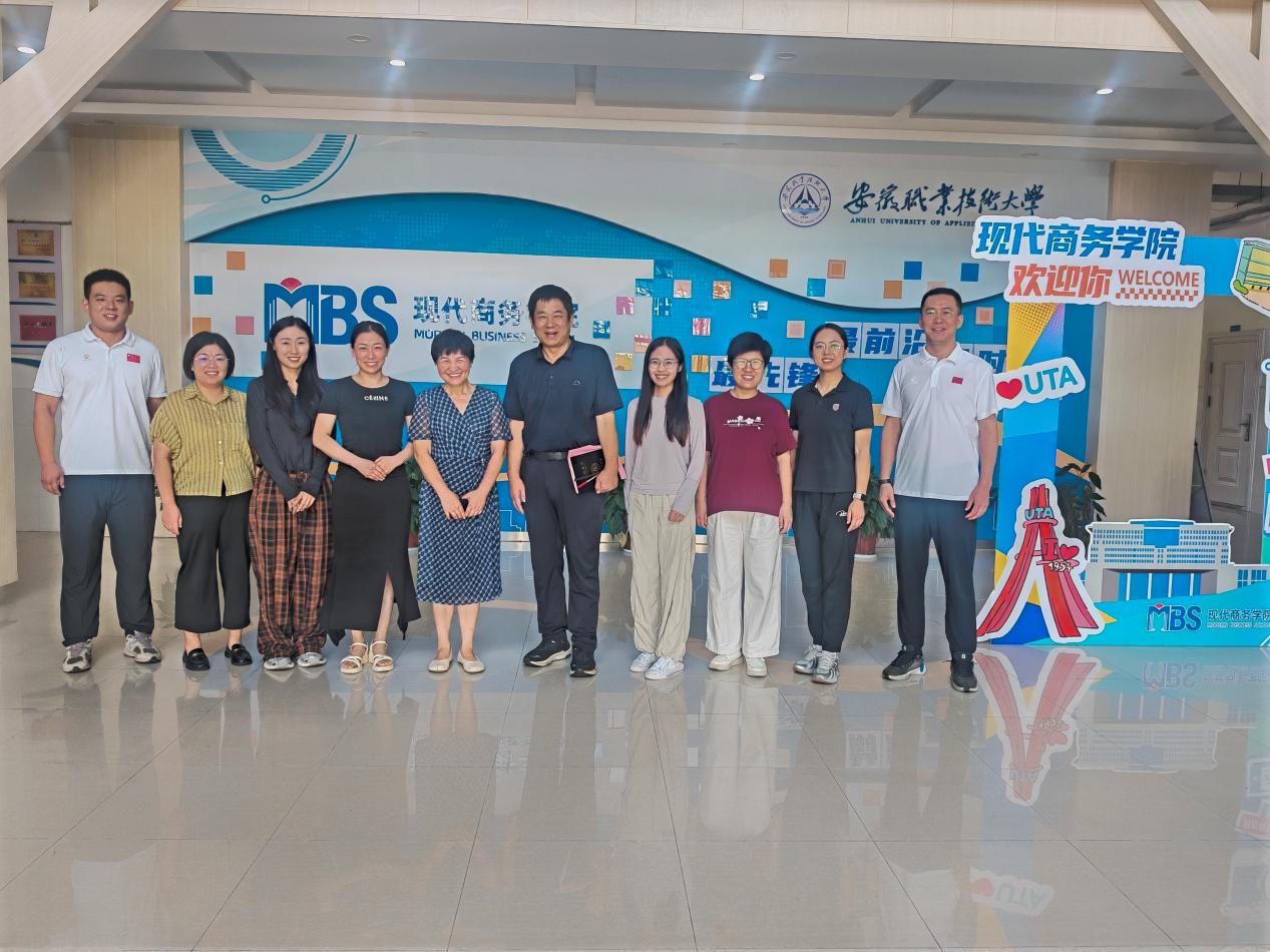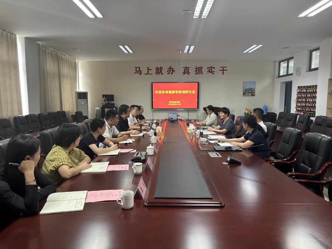 2025年9月16日上午9时,体育健康学院院长高立克一行8人莅临现代商务学院,围绕职业教育本科建设、专业发展、实训基地建设、师资培养等议题开展调研交流。现代商务学院党总支副书记程基鹏、院长杜淑琳及相关部门负责人热情接待。