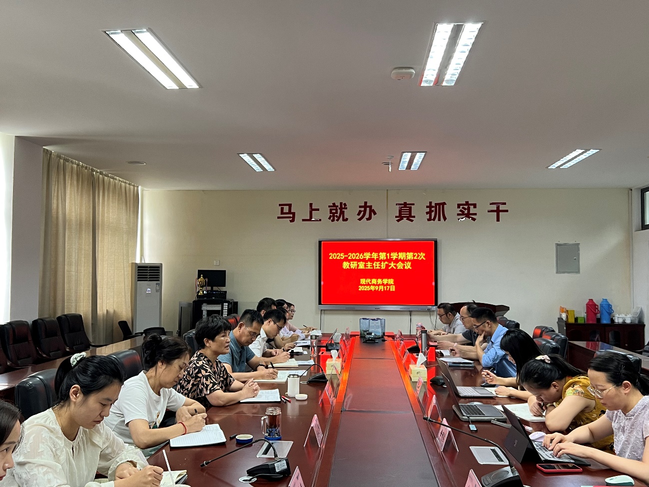 9月17日下午,现代商务学院召开2025-2026学年第一学期第2次教研室主任扩大会议。学院党政负责人、各教研室主任、院职能部门负责人及全体行政坐班教师参会。会议由杜淑琳主持。