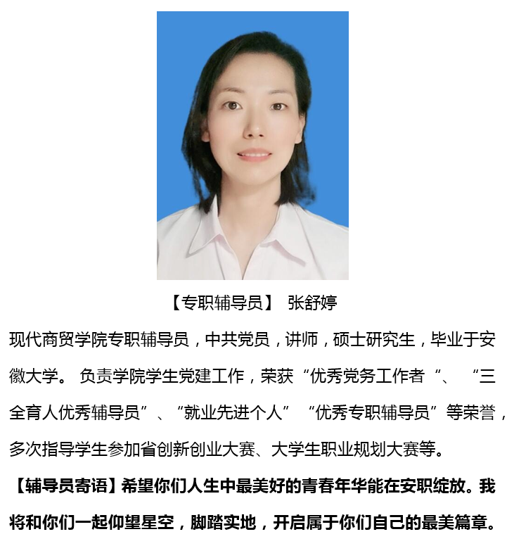 现代商务学院专职辅导员,中共党员,助教,西安电子科技大学本科毕业,学士学位。扎根学生工作一线,负责学生学籍管理、档案等工作。曾获“就业先进个人”称号;指导学生在金融挑战杯斩获国赛三等奖、省赛二等奖,“学创杯”创新创业赛荣获二等奖,并获短视频制作“优秀指导教师”等荣誉。