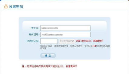 输入考生号,身份证号,点击“发送短信验证码”按钮后,系统会随机发送6位数字验证码至考生报名时所填的手机号上;填写完短信验证码,点击“确定”,跳转至考生修改密码页面,设置考生登录密码。短信验证码只能发送5次,请考生谨慎操作。