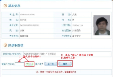 2. 用自己设定的密码重新登录,进入录取院校确认界面: