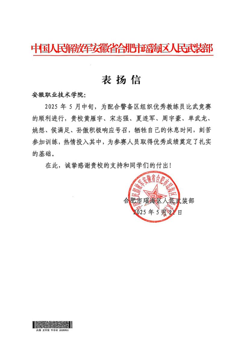 近日,合肥市瑶海区人民武装部向学院发来表扬信,对我院迷彩先锋社的黄雁宇、宋志强、夏连军等8名同学在2025年警备区优秀教练员比武竞赛训练中的卓越表现给予高度评价。信中特别指出,学生们牺牲自己的休息时间,刻苦参加训练,助力参赛团队斩获佳绩,军地协同育人成效显著