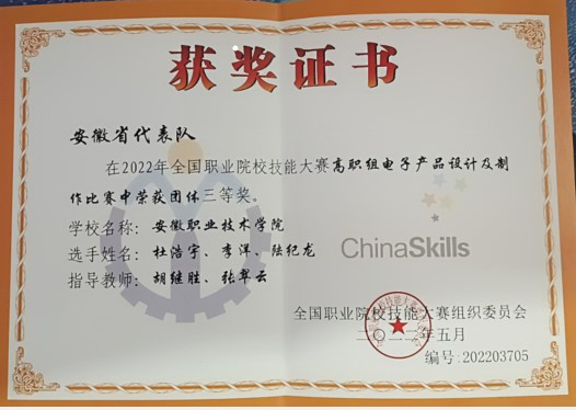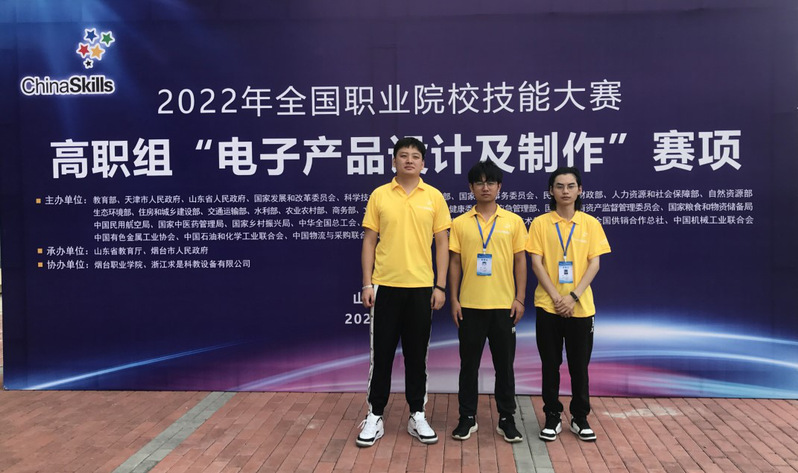8月20日至22日,2022年全国职业院校技能大赛高职组“电子产品设计与制作”赛项在山东烟台职业学院举行。来自全国28个省市、自治区54支参赛队参加了此次比赛,经过激烈角逐,我校计算机与信息技术学院杜浩宇、陆纪龙、李洋三位同学在胡继胜、张翠云两位老师的悉心指导下,以总成绩第20名获得全国三等奖。