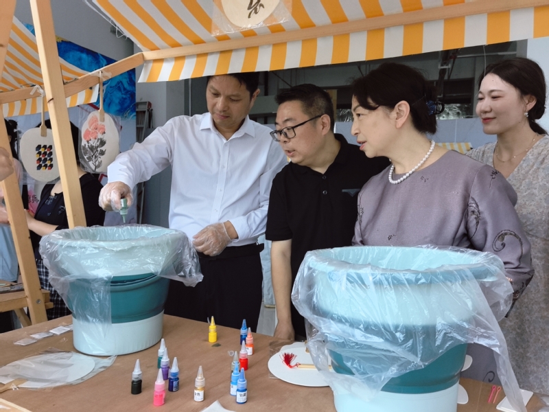 视传与形象设计教研室徐冰清老师作了生动的扇面漂漆技法示范。她细致讲解了漆料的特性、入水的技巧以及如何通过不同的手法让漆料在扇面上形成独一无二的流纹与色彩层次。随后,活动进入核心环节,大家纷纷动手实践,投入到扇面漂漆与彩绘的创作中。活动现场气氛热烈。五彩的漆料在水面晕开,再经由巧手轻蘸,一幅幅流光溢彩、浑然天成的图案便定格于素白的扇面之上。每一把漆扇都成为了一件独特的艺术品,凝聚了师生们的巧思与对美的理解。