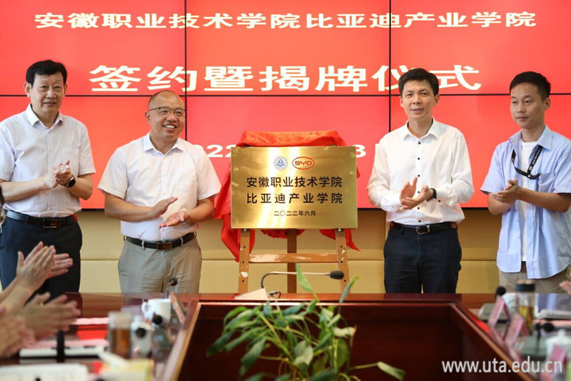 党委书记李方泽表示,5月份学院与长丰县正式签署了全面战略合作框架协议,经过前期积极推进,双方联合申报了乡村振兴科技服务协同创新中心,这也是探索乡村振兴新模式的积极尝试。本次比亚迪产业学院挂牌是全面战略合作框架协议的重要内容之一,意味着政校企合作、产教融合进入了一个新的发展阶段,下一步将在学生就业、教师企业实践、互派干部挂职等方面进一步加强落实。李方泽表示,政校企合作是一条互通互融、共建共享的大道,希望以比亚迪产业学院为契机,政校企三方携手共商共建、不断拓展合作领域、提升合作层次,将新能源汽车教育链、人才链与产业链、创新连有机衔接起来,更好地为地方经济发展培养和输送高素质技术技能型人才,共同推进政校企合作迈上新台阶。