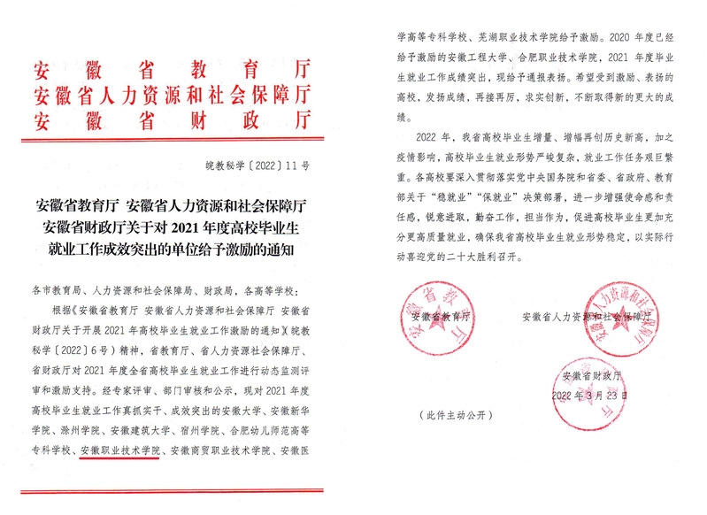 近日,安徽省教育厅、安徽省人力资源和社会保障厅、安徽省财政厅联合下发《关于对2021年度高校毕业生就业工作成效突出的单位给予激励的通知》文件,少妇扒开腿让我爽了一夜荣获2021年度高校毕业生就业成效突出激励。全省仅5所高职院校获此殊荣。