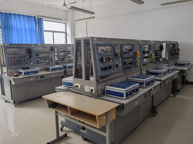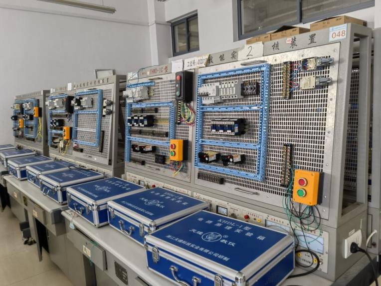 电气控制实训室是一个技术综合性较高的实训室,可用于机电一体化技术、电气自动化、应用电子技术等专业的学生在学完《电工基础》、《电机与电气控制》等课程后,进行综合技能训练。本实训室可开设电工考工实训、是学生的第二课堂;主要进行电气课程设计实训,能提供电机拖动、PLC等相关内容的各种实训项目,也可作为电工考证的考核重要场所。该实训室配备THWD-1C型维修电工技能实训考核装置25套,50个工位。实训装置主要有实训桌和网孔板组成,拥有电气控制柜,电机控制系统实验装置、电机控制系统演示装置等实训设备。有各种继电器、接触器、开关按钮等供学生选用,学生通过实训线路进行元器件的布局安装,接线全部由学生自行完成,有利于培养学生的动手能力和操作技能。能够开设三相异步电动机单向旋转控制电路的安装与调试、三相异步电动机正反转带点动控制电路的安装及调试、三相异步电动机正反转控制电路的安装与调试、三相异步电动机两地可逆控制电路的安装与调试、工作台自动往返控制电路的安装与调试、半波整流能耗制动控制电路的安装与调试、三相异步电动机顺序起动、逆序停车控制电路的安装与调试、三相异步电动机同时、分别起动、顺序停车控制电路的安装与调试、三相异步电动机星形-三角形降压起动控制电路的安装及调试、双速电动机自动加速控制电路的安装与调试、低压配电控制电路的安装与调试等多项实训和实验项目。