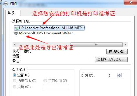 点击此按钮后,选择电脑上安装的打印机将打印出纸质准考证,选择“Microsoft XPS Document Writer”将打印出xps格式的文件,保存此文件至存储设备,可在任意一台打印机上打印出纸质准考证。
