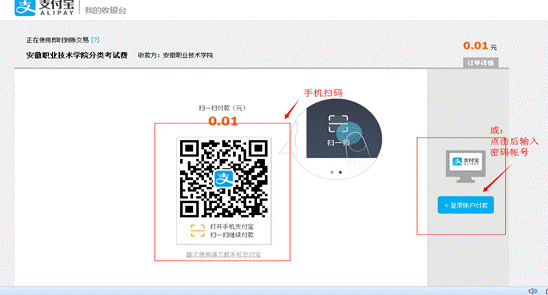 考生点击“考生信息确认”选项卡下方的“支付宝”,查验交费信息无误后“确认支付”,系统将跳转到支付宝支付页面。可以用手机支付宝app扫描二维码或点击右方“登陆账户付款”后输入帐号和支付密码完成支付。